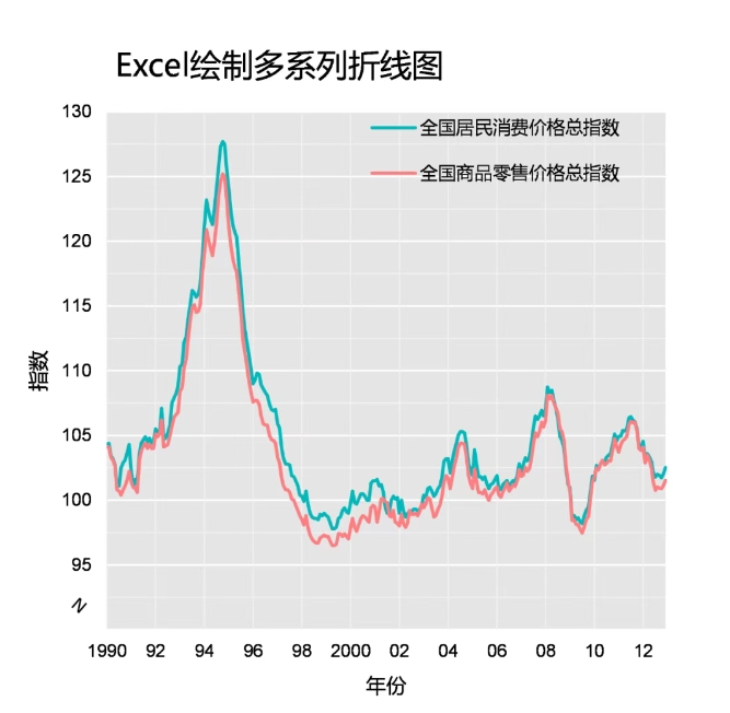 本节内容将详细讲解多系列折线图的绘制方法。在上一节中,我们已介绍过单系列折线图与面积图的绘制技巧。为帮助尚未了解单系列折线图与面积图绘制的读者,本次讲解的内容同样较为基础,先通过示例图进行展示。以下示例图展示了两种不同样式的多系列折线图。其中第一种采用背景色填充,第二种则保持简洁的设计风格。 A、B两张图表的绘制方法与上文所述内容完全一致。进行数据处理时,首先需要明确数据源信息:A图的时间序列始于第一个年份,该年份对应A图的X轴坐标;B图的时间序列自第二个年份开始,该年份对应B图的X轴坐标。 下面是绘制这两幅图的具体步骤说明: