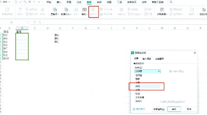 4.在验证条件中选择"序列",并填写选项区域作为输入来源